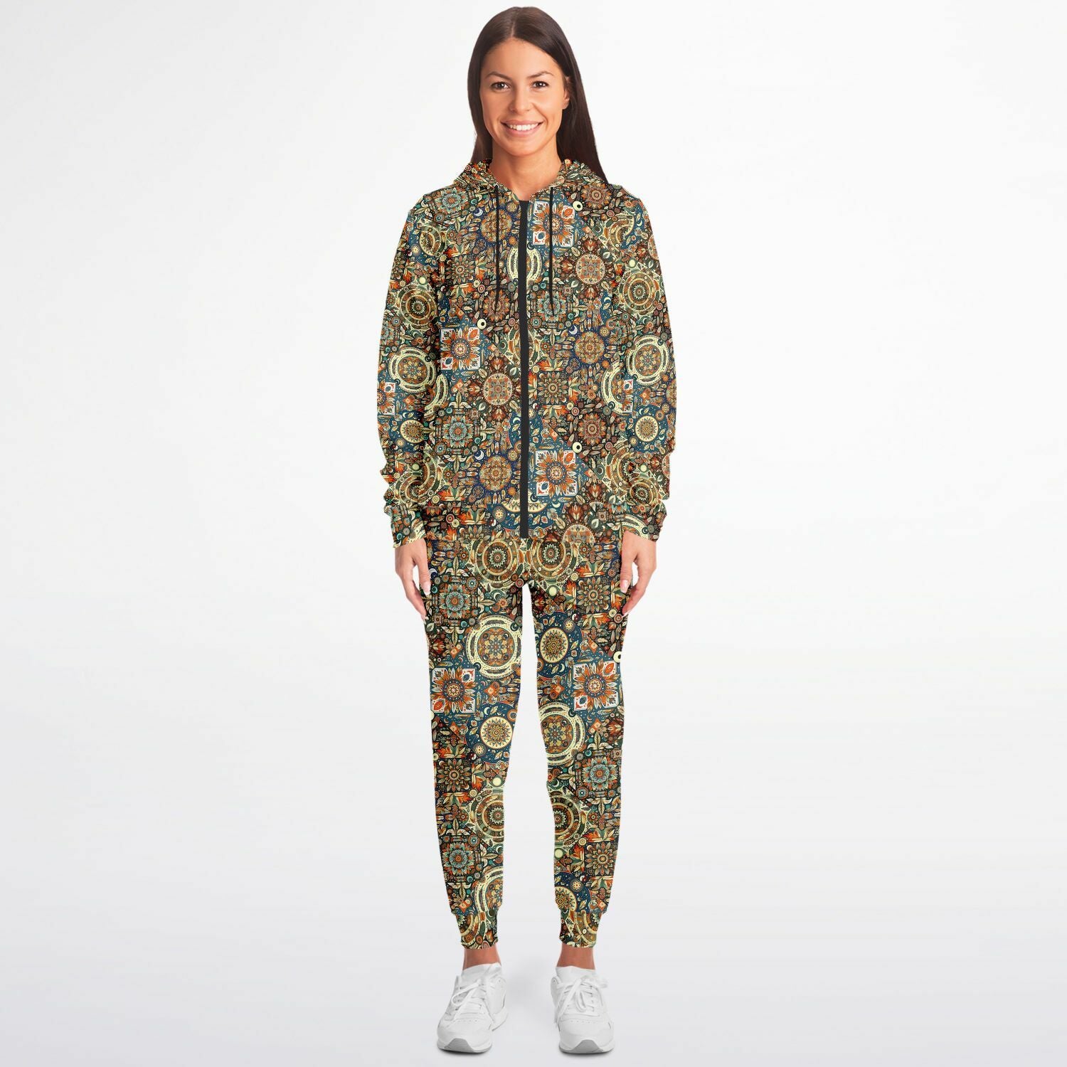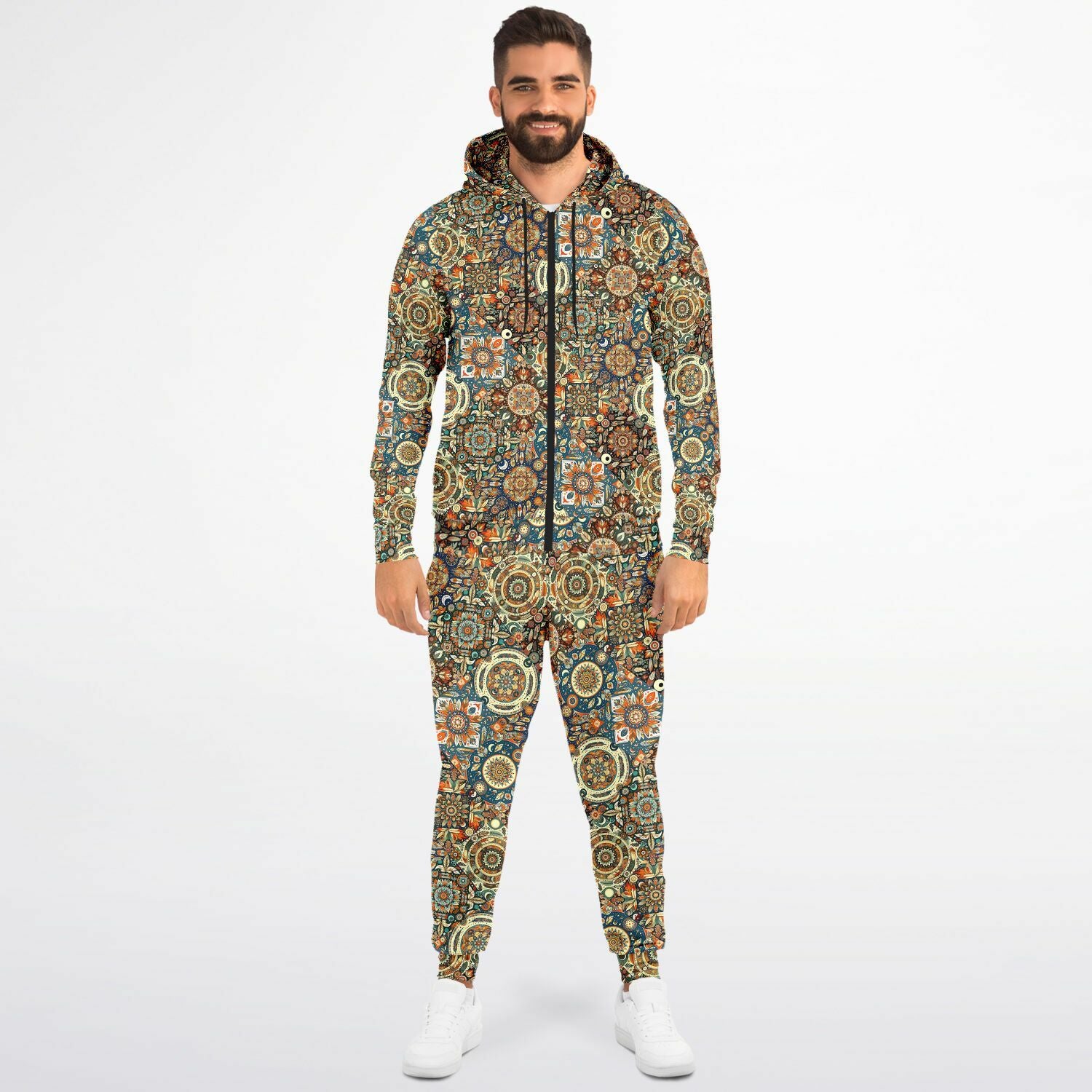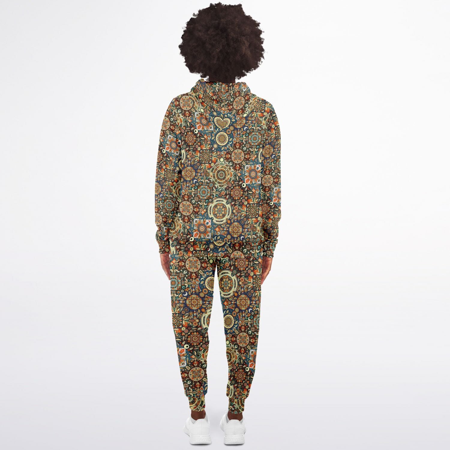 Boho Patchwork Zip Hoodie & Jogger Set – Bohemian Style Loungewear, Trendy All-Over Print Tracksuit, Casual Streetwear & Comfortable Activewear