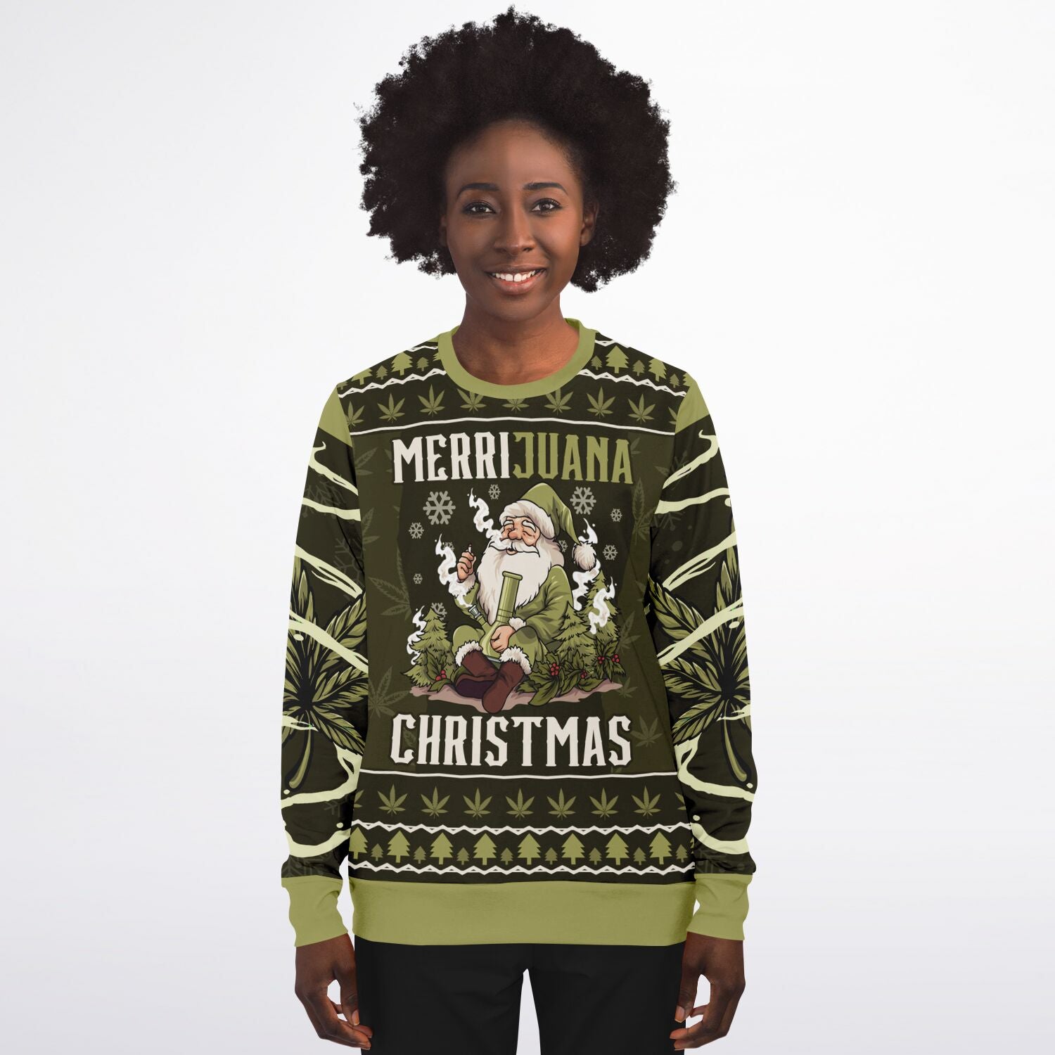 Funny Cannabis Christmas Sweatshirt – “Merrijuana” Weed Santa Jumper, Stoner Holiday Gift Idea