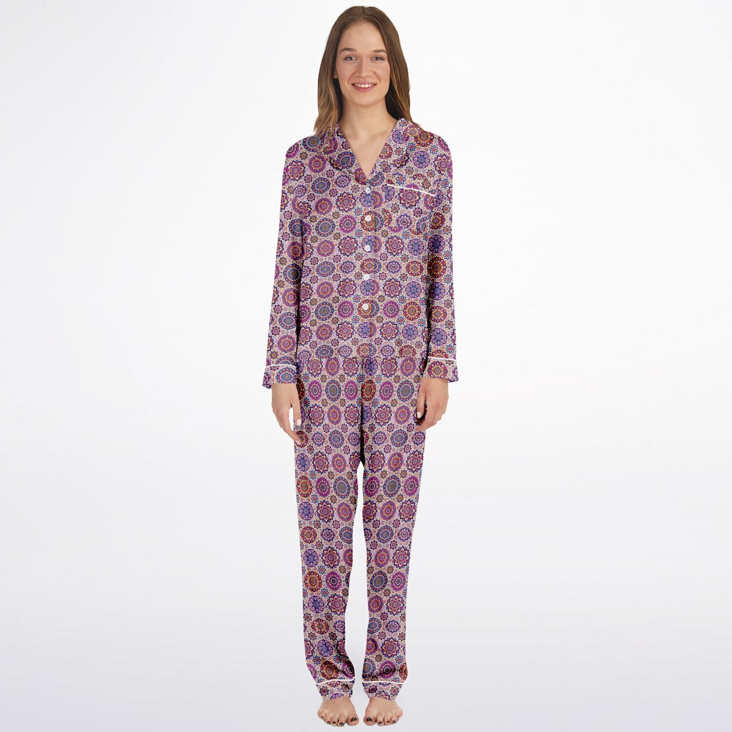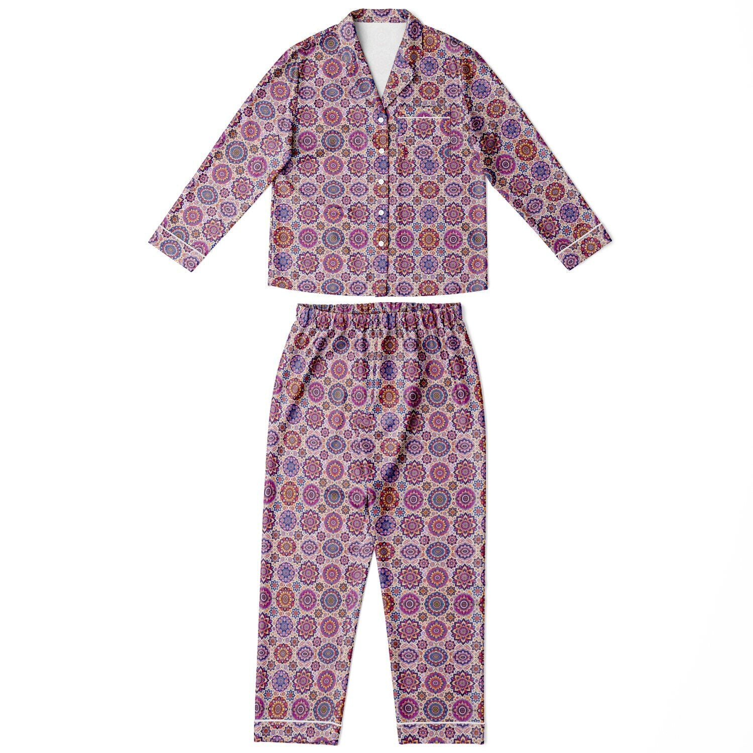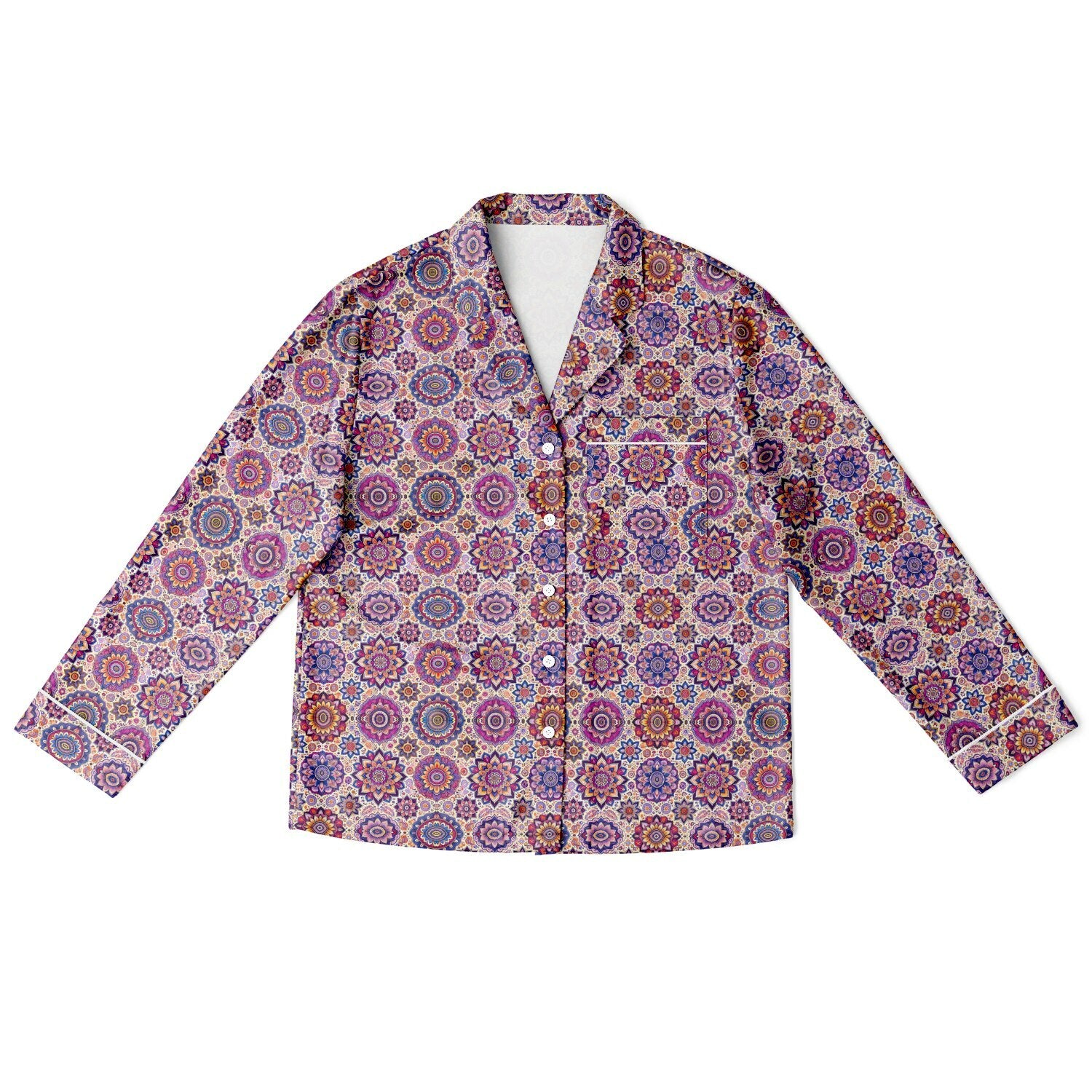 Treat yourself to the elegance and comfort you deserve with our luxury pink geometric satin pajama set. Crafted to provide an exceptional sleep experience, this all-over print satin pajama set offers a blend of softness, style, and comfort, making it the perfect addition to your sleepwear collection.