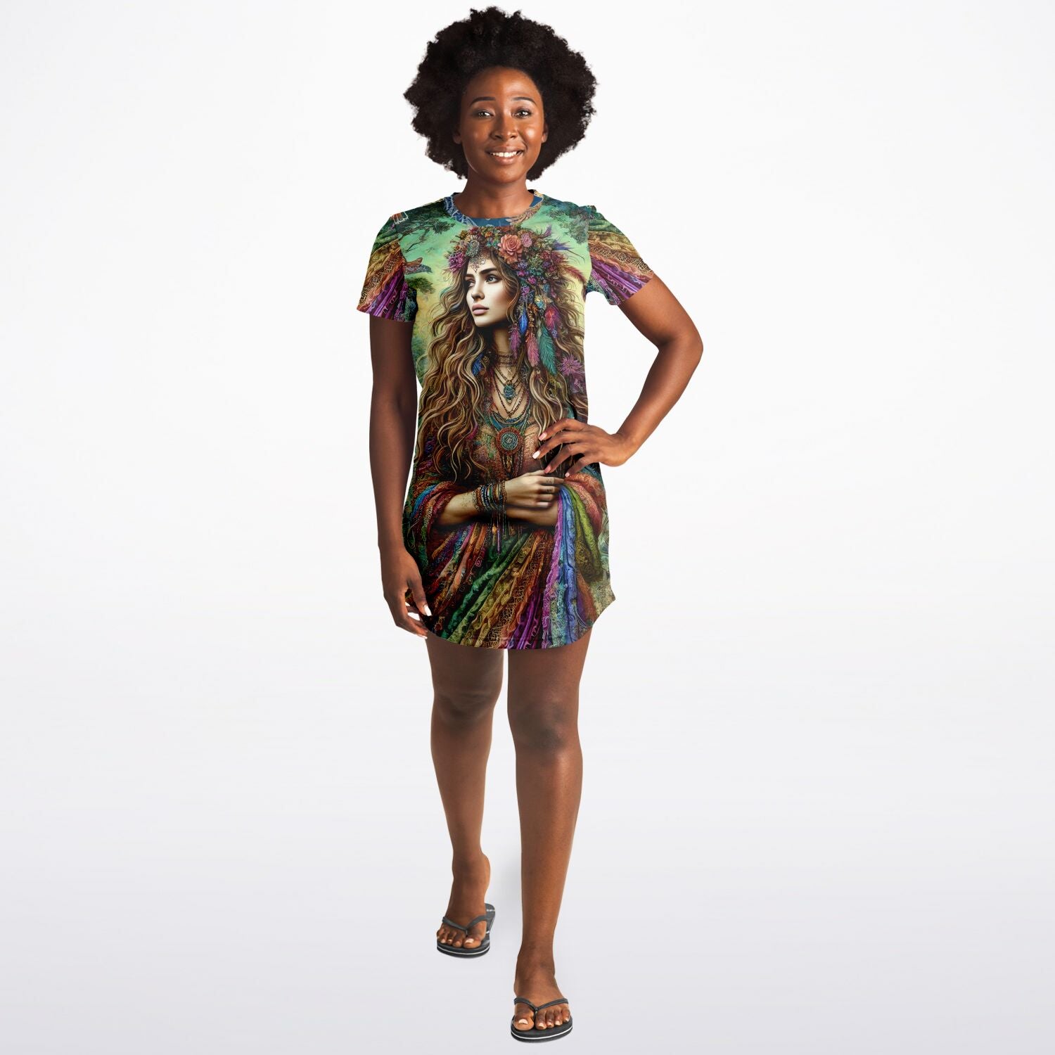 Spiritual Goddess Trinity Collection T-Shirt Dress – Vibrant All-Over Print (AOP) Featuring Unique Faces for Boho Chic Comfort