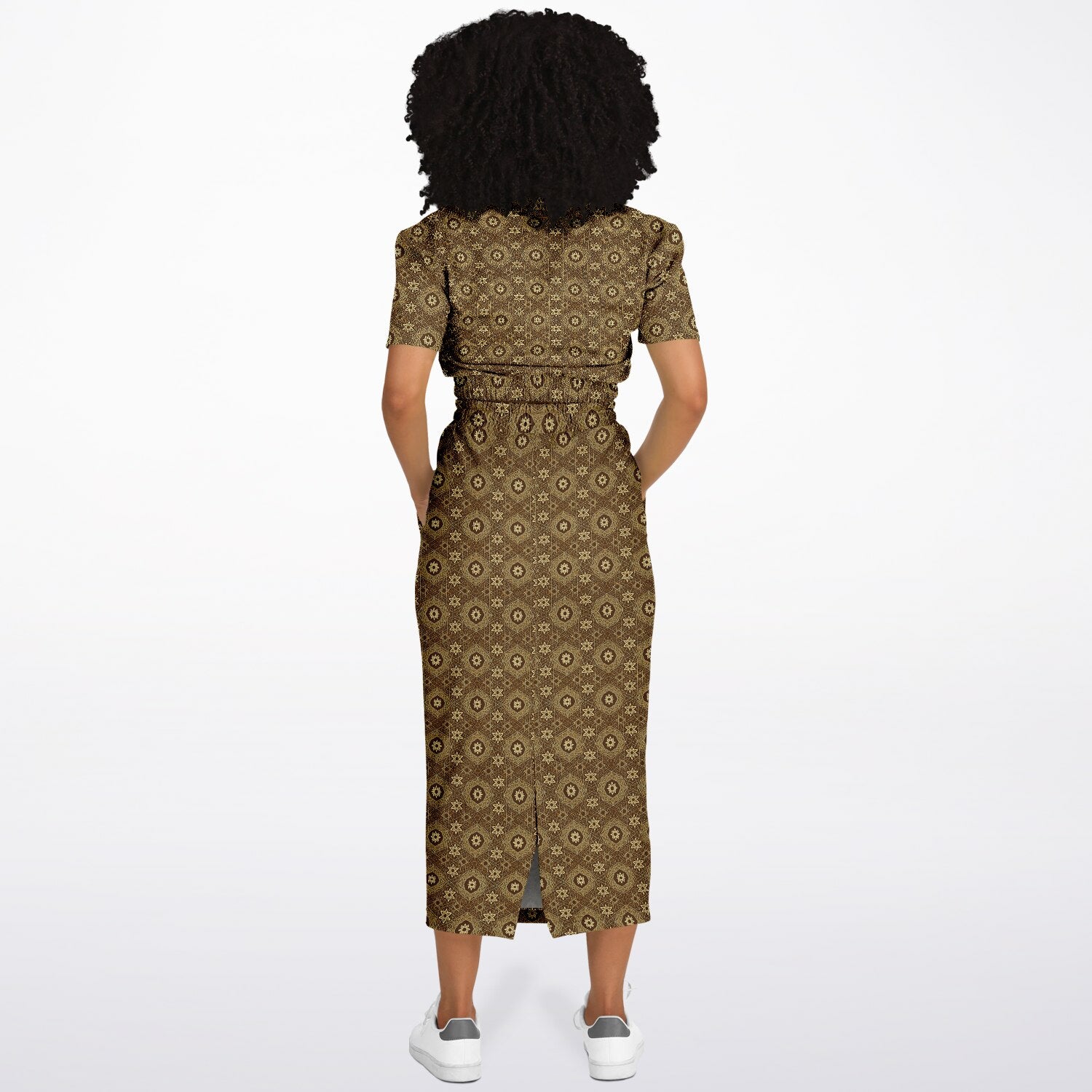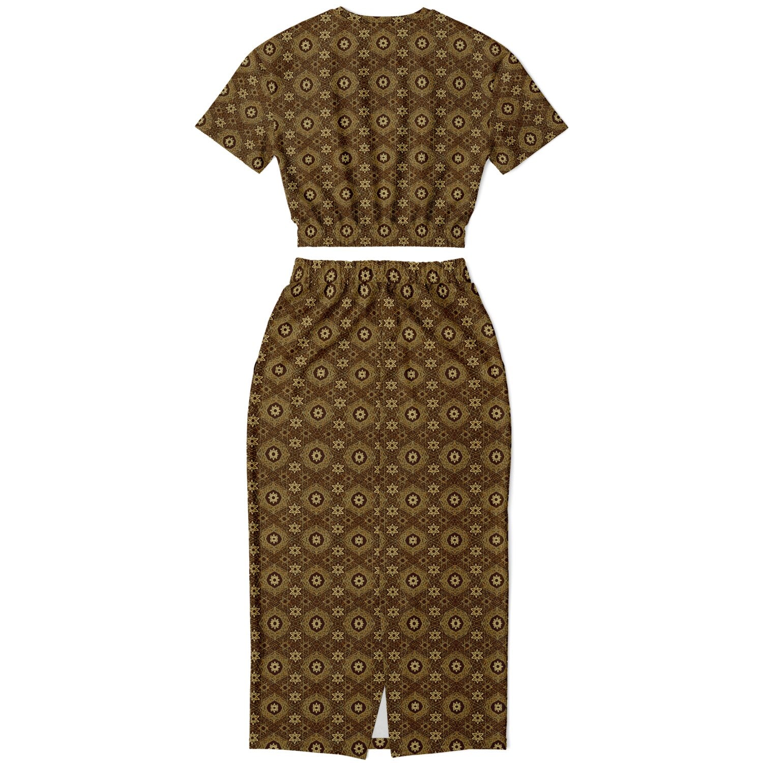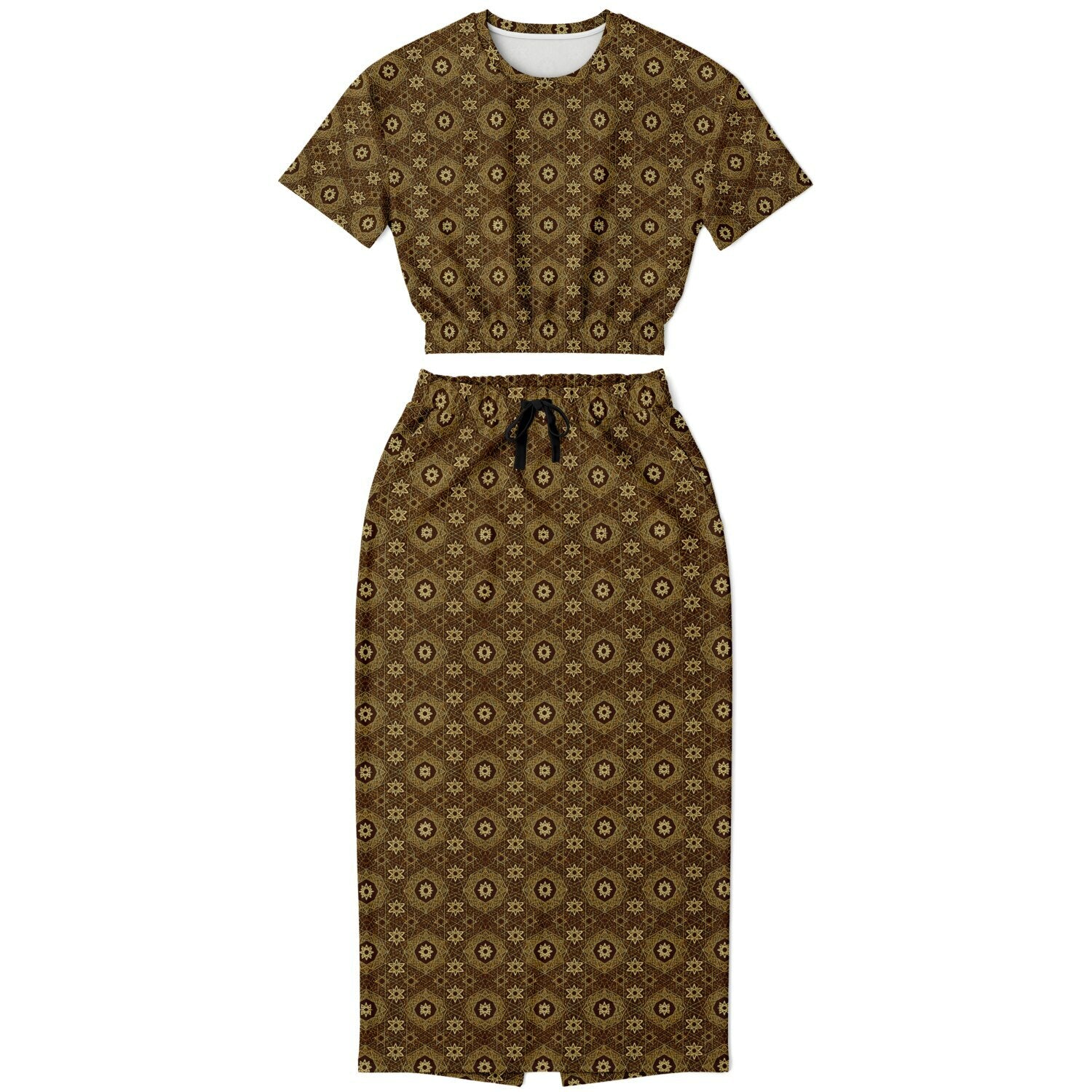 Geometric Gold Pattern Cropped Sweatshirt & Long Pocket Skirt Set – Bold Two-Piece Co-ord for Streetwear, Loungewear & Casual Outfits (AOP)